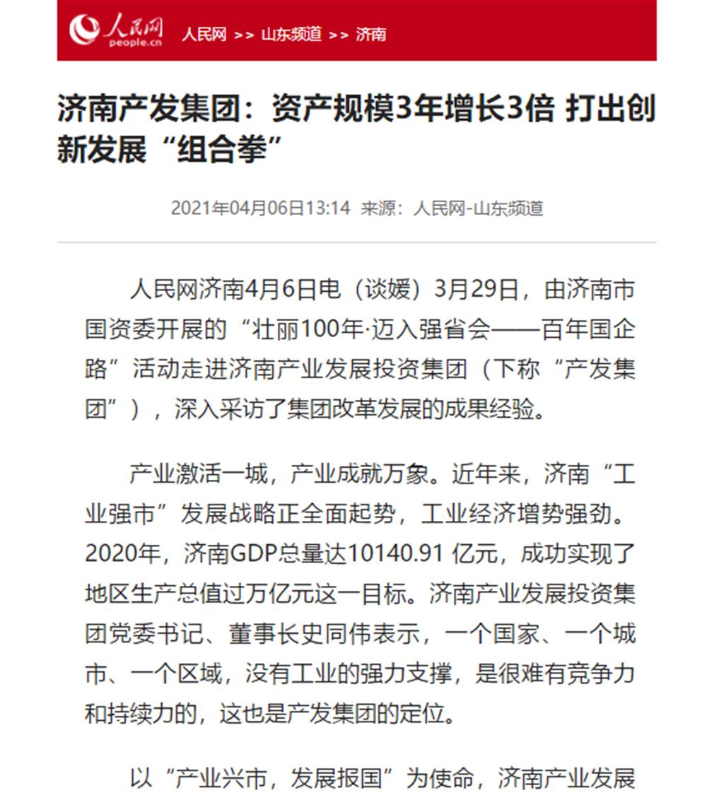 近日,市國(guó)資委舉辦的“壯麗100年·邁入強(qiáng)省會(huì)——百年國(guó)企路”媒體團(tuán)一行到訪濟(jì)南產(chǎn)發(fā)集團(tuán)后,人民網(wǎng)、大眾網(wǎng)、閃電新聞、濟(jì)南電視臺(tái)、濟(jì)南日?qǐng)?bào)、帶濟(jì)南等多家國(guó)家、省市級(jí)媒體聚焦報(bào)道了集團(tuán)改革發(fā)展的成果經(jīng)驗(yàn)。